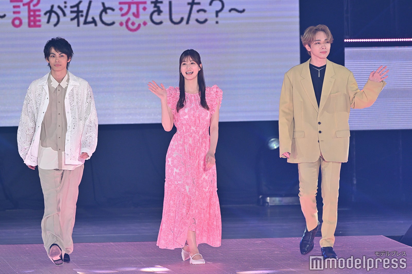 本作はある事故で記憶喪失になった主人公・緒方まこと(生見)が、手元に残された男性用の指輪を手掛かりに「恋の相手」と「本当の自分」を探すラブコメミステリー。スペシャルステージには生見に加え、主人公の同僚・朝日結生を演じる神尾、素性不明の年下男子・板垣律役を演じる宮世が登場した。ピンクのノースリーブ姿の生見をセンターに、華やかに登場した3人。宮世はイエローの華やかなセットアップ、神尾はベージュのセットアップに涼しげな白のシャツを羽織り、笑顔でウォーキングを披露した。ランウェイトップでは生見の肩に2人が手を置いて決めポーズ。終始仲睦まじい様子を見せ、観客を癒やした。