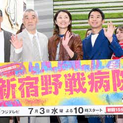 女優の小池栄子が6月26日、フジテレビ系ドラマ『新宿野戦病院』(毎週水曜22時~/7月3日スタート)の制作記者会見に共演の仲野太賀、濱田岳、生瀬勝久、柄本明とともに出席。同作の主題歌を務めるサザンオールスターズの桑田佳祐からのサプライズに感動する場面があった。