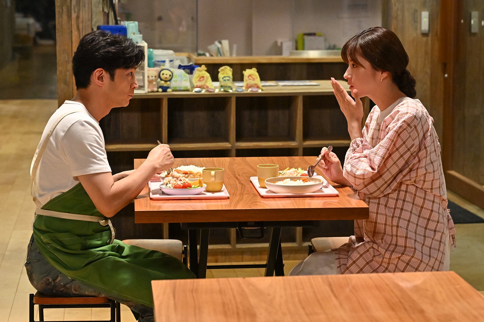 第6話は、“偽家族”も西園寺さん自身も新しいフェーズに入っていく回になると思います。ここまでで“偽家族”という関係性の実態がなんとなく掴めてきたような気がしていた西園寺さんたちでしたが、家族とはそう簡単ではないもの。西園寺さんの中にも、楠見の中にも、何か新しい感情が芽生えたようですし、どんどん複雑な感情や言語化できない思いが出てきて、その思いが交差していきます。さらに、横井も西園寺さんにグッと気持ちを向けていくので、第6話は横井の存在感がぐっと濃くなっていく回でもあります。横井は原作でもすごく素敵なキャラクター。ドラマでは津田健次郎さんに演じていただいているので、大人だからこそのカッコよさを一緒に作っていきたいなと考えていました。そこで大事にしているのは、カッコよさというのは、スマートさだけじゃないということ。取り繕って自分を良く見せるのではなくて、素の自分を見せられるとか、自分が考えていることを素直に伝えて知ってもらうことができる。そんな、大人で素直な人だけができる、カッコつけないカッコよさがあると思うんです。横井はこれまで、ミステリアスな人に映っていたと思いますが、YouTuberとしてのサングラス姿からは想像できないような素顔があることは視聴者の方にも少しずつ伝わっているのではないかと思います。そこをさらに踏み込んで、横井が一体何を考えているのか、人とのつながりをどう捉えているのか。そんな彼の姿を津田さんが本当にチャーミングに演じてくださっています。西園寺さん(松本若菜)&楠見(松村北斗)「家族会議」で垣間見える関係性