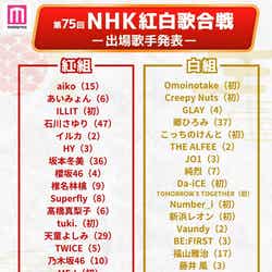 今年のテーマは「あなたへの歌」。司会は有吉弘行(2年連続2回目)、橋本環奈(3年連続3回目)、伊藤沙莉(初)、鈴木奈穂子アナウンサー(初)の4人が担当する。出場歌手は41組で、初出場(50音順)は紅組がILLIT(読み:アイリット)、tuki(読み:ツキ).、ME:I(読み:ミーアイ)、白組がOmoinotake、Creepy Nuts、こっちのけんと、Da-iCE、TOMORROW X TOGETHER(読み:トゥモロー・バイ・トゥギャザー)、Number_i(読み:ナンバーアイ)、新浜レオン。12月31日(火)午後7時20分から11時45分まで、NHK総合、BSP4K、BS8K、ラジオ第1で生放送される。(modelpress編集部)