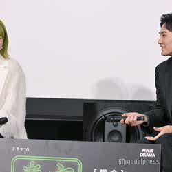 女優の奈緒と俳優の松田龍平が12月10日、都内で開催された2025年1月7日スタートのNHKドラマ10「東京サラダボウル」(総合テレビ/毎週火曜夜10:00〜10:45・BSP4K午後6:15〜7:00/全9話)の完成試写会に出席。奈緒が、役作りで染めた緑ヘアを披露した。