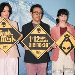本作は、2023年1月期放送の同局系「ブラッシュアップライフ」の脚本を務めたバカリズムと制作チームが再集結したオリジナルドラマ。富士山麓の町のビジネスホテルに勤めるシングルマザーの主人公・遠藤清美(市川)が、ある日、宇宙人に出会ったことから物語がはじまる地元系エイリアン・ヒューマン・コメディーとなっている。宇宙人の正体が何なのか、詳細は明らかになっていない。報道陣向けへ試写も行われたこの日、市川は「皆様はもうすでに宇宙人がどんな形なのか、ご存知だと思うんですけど、今まで私たちは宣伝活動する中で1話のオンエアで観てくださる方に『え~!』って思っていただきたいので、死守してまいりました。どうか皆様も共犯者となって素敵な記事を書いていただけたらと思います」と挨拶。ドラマの注目してほしいポイントを紹介する場面では、フリップに「宇宙人」と書き、「『ホットスポット』の宇宙人。宇宙一可愛いです。回を追うごとに清美と宇宙人の関係性がね…」と正体に言及した。