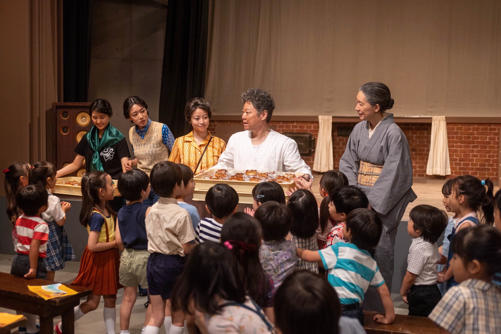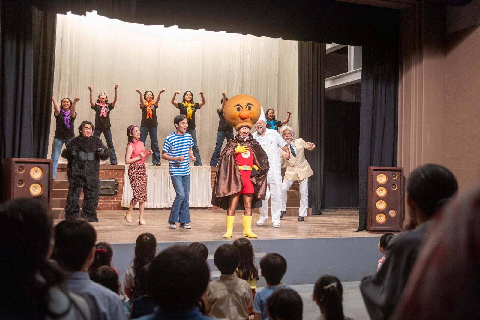 嵩と作曲家・いせたくや(大森元貴)が手掛けるミュージカル「怪傑アンパンマン」の初日が大成功に終わった。終演後、パン職人・草吉(阿部サダヲ)がアンパンマンの顔を模したあんぱんを抱えて現れ、嵩と再会。嵩は感極まって草吉に抱きつき、再会を喜んだ。草吉はアンパンマンについて「最初に描いてた変なおじさんのアンパンマンより随分マシになってたな」と言いながら「お前らしい作品だからいいんじゃねえか」「あれ読んでわかったよ。お前も戦争に行ったんだな」と呟く。嵩は「お腹を空かせた人にあんぱんを届ける。敵も味方も関係ない。どっちが正義かもどっちが悪かも関係なく、ただパンを届ける。これが僕の思うヒーローなんです」とアンパンマンに込めた思いを吐露。草吉は戦地で空腹をしのぐために倒れている兵隊から乾パン奪って生き延びたことを明かし「あのときアンパンマンがいてくれりゃな〜」と笑った。