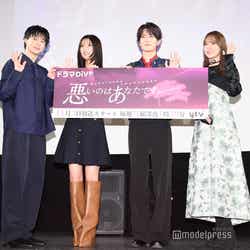 原作は「文春オンライン」での連載開始から現在までに累計3900万PVを獲得した、ふせでぃ氏の同名漫画(文藝春秋)。怒涛の勢いで「不倫沼」にハマりこんでいく“超破滅的恋愛譚”をドラマ化する。この日は、先行試写会後に出演者が登場。山中は黒髪にヘアチェンジした姿で登壇した。山中が演じる椿タクマは、29歳で夢を追いかけるバンドマン。家賃・光熱費を一緒に暮らしている彼女に負担してもらっている、いわゆる“ヒモ”。「今を楽しく生きようよ」と楽観的で無邪気に生きている。オンエアを控えた現在の心境を聞かれると、山中は「それぞれチャレンジしたお芝居がたくさんあった」といい、「新たな気持ちで面白いか自分で観ようと思っています」とコメント。小川から「どうでした?面白かったですか?」と聞かれると「めちゃくちゃ面白かったです!最終に向けて僕も視聴者として観ていこうかなと思ってます」と笑顔を見せた。