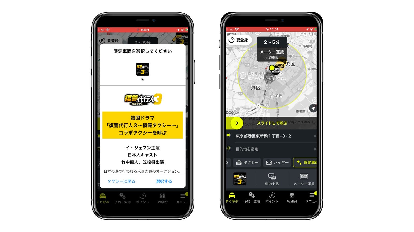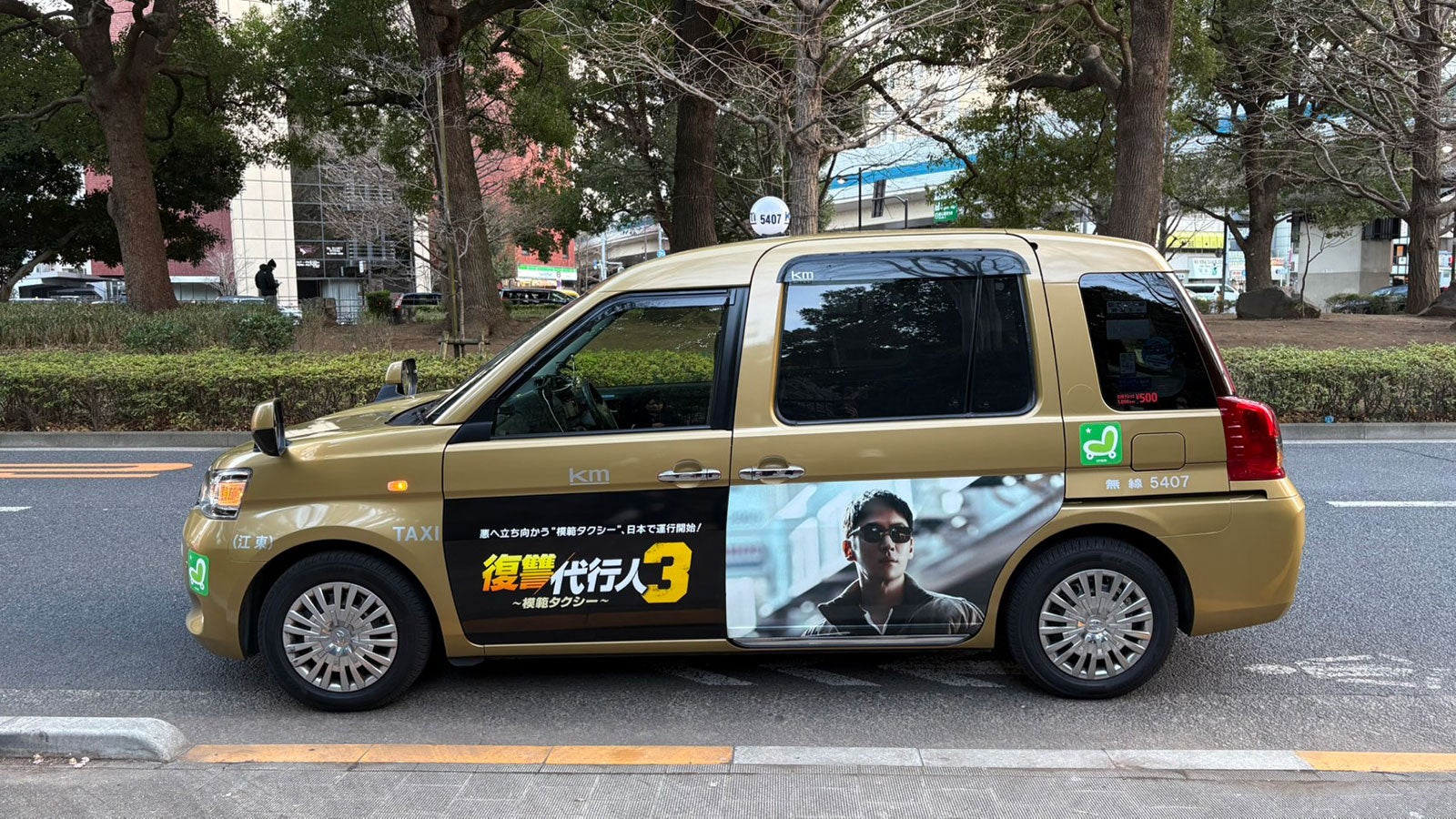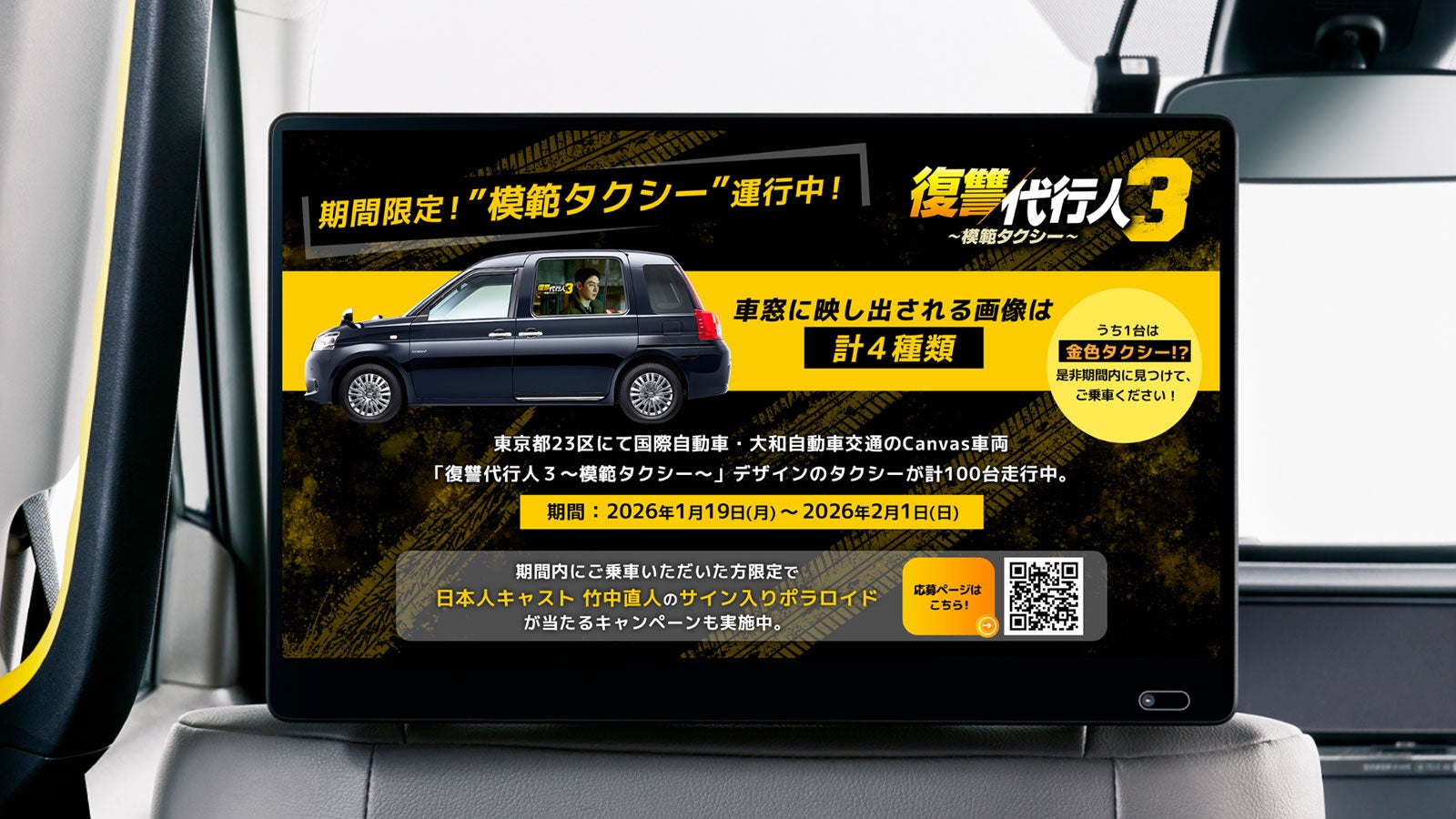 2026年1月19日から2月1日の2週間、「復讐代行人3~模範タクシー~」のドラマオリジナルタクシー計100台が、東京都内(23区・武蔵野/三鷹地区)を走行。本施策では、タクシー車体を作品仕様にラッピング。モビリティ車窓メディア「Canvas」では主演のジェフンの迫力あるビジュアルを掲出し、車内のタクシーサイネージメディア「GROWTH」では本施策限定の特別映像を放映した。さらに、100台のうち1台は"金色ラッピングタクシー"として特別仕様で走行。街中で目を引く存在となり、SNS上でも多くの投稿が寄せられた。劇中で「模範タクシー」を率いるキム・ドギを演じるジェフンも、実際にタクシーに乗車。ドラマの世界観を表現した空間を体験する貴重な機会となった。