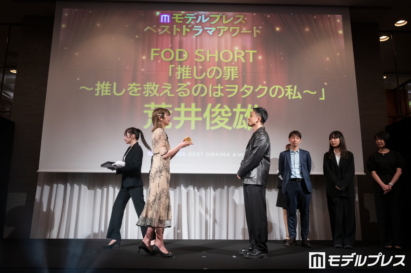 読者から届いた熱い声をもとに、モデルプレス編集部が制定した6つの部門で、2025年のドラマ・バラエティ・恋愛リアリティーショーなどのエンタメコンテンツで魅力的なキャストやシーンを称える「最強コンテンツ賞」。同部門は「推しの罪~推しを救えるのはヲタクの私~」のほか、テレ東・DMMショート「夫を社会的に抹殺する5つの方法 Re:venge」、DMMショート「#裏アカ教師」が選出された。荒井プロデューサーは「昨年7月にFOD SHORTをスタートさせたのですが、アプリをサービスローンチする前に『推しの罪』という作品を作り始めました。やはり新しいチャレンジだったので、自分自身も、会社としてもいろいろな悩みはあったのですが、先がまだ見えない中、キャストの皆様、制作パートナーの皆様、そしてスタッフの皆様が力を貸してくれて、今日のこの賞に至ったと思っております」と手探りの状態から共に歩んだチームへの感謝を言葉に。