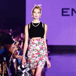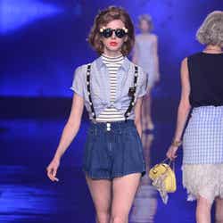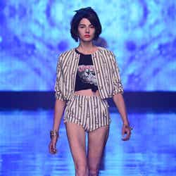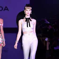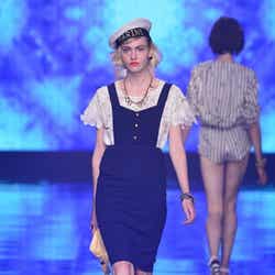 今回のコレクションは新たな試みとして、「GIRLS/LADIES/GAL/GLOBAL」という4つのジャンルに分かれたステージ構成で展開。『GIRLS』は「dazzlin」「Ungrid」「jouetie」、『LADIES』は「MERCURYDUO」「LagunaMoon」、『GAL』は「EMODA」「GYDA」、『GLOBAL』は「MURUA」といったようにジャンル分けすることで、各ブランドの世界観やターゲット層をより明確に打ち出した。「MURUA」は、今回もスタイリストに「The New York Times T Magazine」スタイル・ディレクターのケイト・ランフィアを起用し、よりグローバルなクリエイティビティでフェミニンモードを発信。中でもワイヤー、PVCなどの異素材を組み合わせた繊細なデザインが来場者の目を引いた。