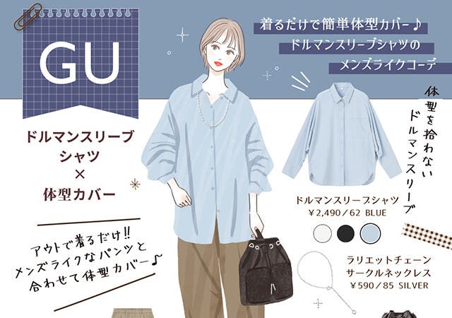 こんにちは!おしゃれ大好き♪イラストレーターの田口ヒロミです。今回はGU「ドルマンスリーブシャツ」を使った、体型カバーが叶うメンズライクコーデをご紹介します。体型を拾わないシャツは1枚あるとめっちゃ助かる〜!それでは行ってみましょう♪