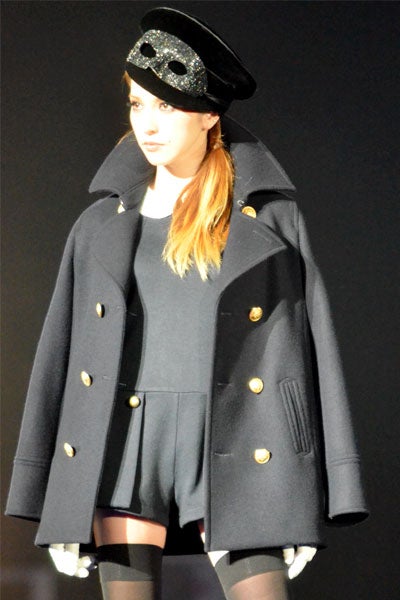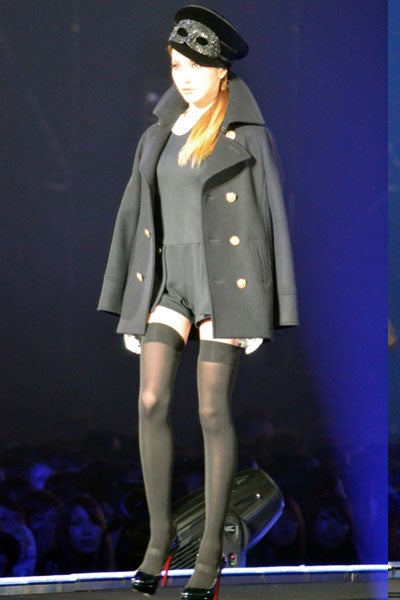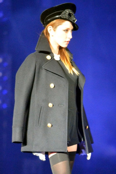 「THE NIGHT PORTER」ステージで開幕した同イベント。藤井リナの衣装はブラックのミリタリーピーコートにインナーもブラックのオールインワン。ヘッドにはブラックのミリタリーハット。足元はブラックのクリスチャン・ルブタンのパンプスにブラックの透けニーハイソックス。