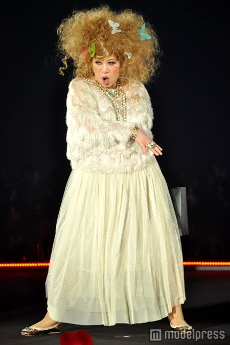 ウィッグブランド「PRISILA(プリシラ)」ステージの大トリをつとめたあき竹城は、蝶のモチーフを施したボリューミーなウィッグにギャルメイク、この春トレンドのシフォンスカートを身にまといウォーキング。