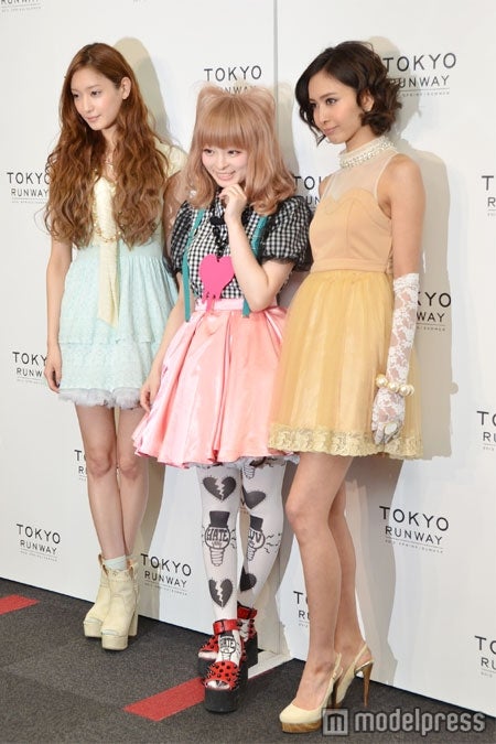 長身の菜々緒、加藤夏希に挟まれたきゃりーぱみゅぱみゅは「周りのモデルさんがハンパなく綺麗で、私なんて公開処刑」と自虐的にコメント。今日の衣装のテーマは「未確認生物」と解説し「宇宙人っぽくしてみました。気力で立てた“エア猫耳ヘア”がポイントです」と笑いを誘った。