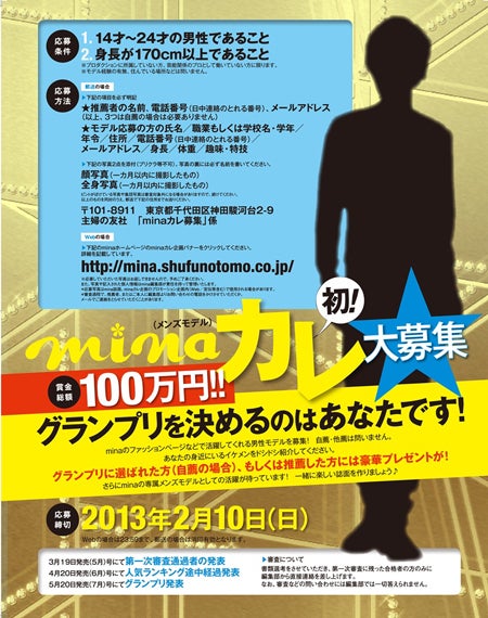 同誌が専属の男性モデルを募集するのは、2001年3月の創刊以来初めてのこと。同オーディションは、「minaカレ」として読者の理想でありながら親近感のある男性を登場させることで「mina」をもっと身近に感じてもらうことを目的に企画された。