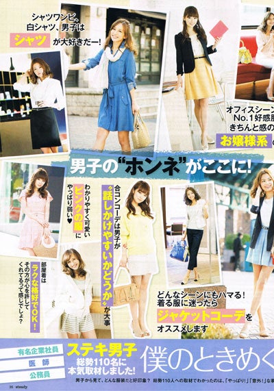 そんな読者たちのお悩みを解決すべく、総勢110名の“ステキ男子”が集結した。「りそな銀行」「日産自動車」「花王」「アサヒビール」「サイバーエージェント」など有名企業9社が誇る男性社員各10名、医師&公務員各10名が取材に協力。モデルの顔を隠したコーデ写真でアンケートを取り、「オフィスシーン」「合コン」「同窓会」といったシチュエーション別の好感服をランキングした。