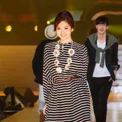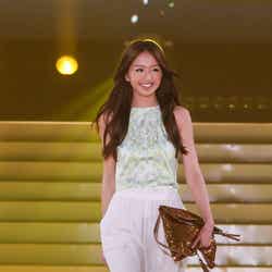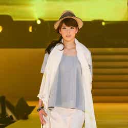 イベントはミューズをつとめる初音ミクとDJ DAISHI DANCEのコラボレーションによるSPECIAL LIVE ACTで幕開け。ファッションショーのトップバッターを飾ったのは、ベビーピンク×ミントグリーンのカラーブロックドレスに身を包んだタレントの紗栄子。会場を華やかな春の空気で包み込み、大歓声を浴びた。