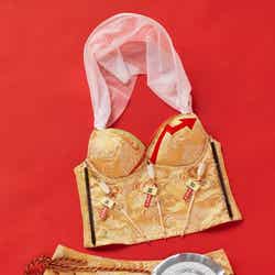「ブラノミクスブラ」は、日本の福の神「七福神」唯一の女性であり、富と芸事の女神、弁財天(弁才天)をイメージ。金運アップの黄色をベースカラーに、羽衣をイメージしたストラップ、着物風のロングブラジャーと巻きスカートのセパレートタイプの仕様となっている。