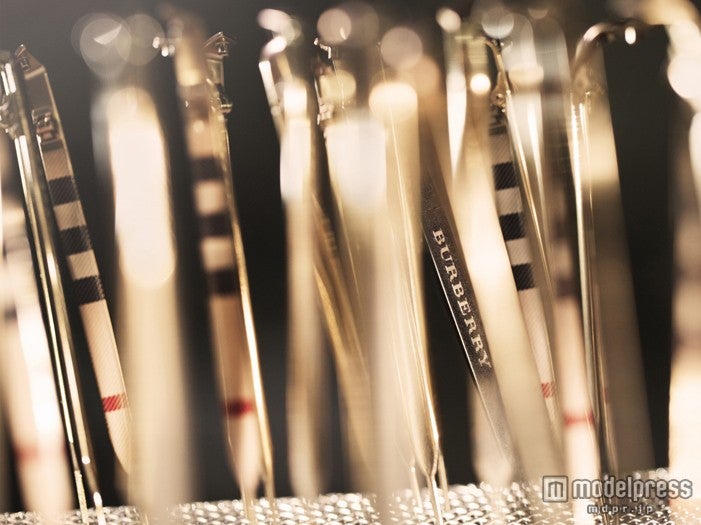 トレンチコートのレザーバックルにインスパイアされたテンプルチップは、同系色のステッチを施したレザー製を採用。また、トレンチコートのネック部分のフック開閉を模したノーズパッドや、コートの裏地のバーバリーチェックをテンプル内外にエナメル加工をするなど、コレクション全体より職人の技を感じられる。アセテートや色付けの全工程はカスタムプロセスにより、 ハニーからストーン・アンド・ブラックに至るトレンチシェードを実現した。