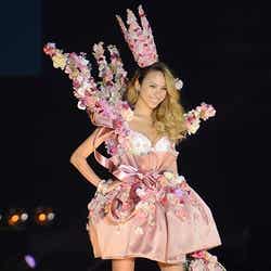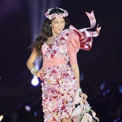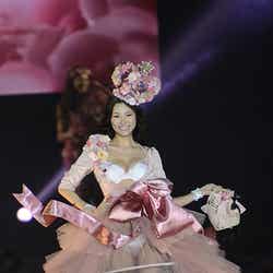 ランジェリーブランド「PEACH JOHN」ステージに登場した道端。ホワイトを貴重とした花柄ランジェリー、ピンク系統の花がふんだんにあしらわれた衣装で、堂々とウォーキング。トップモデルの名にふさわしい迫力のステージに、訪れた約9800人の観客は一気に悩殺された。続けて、カロリナ、ケリーアン、七菜香、松尾幸実、エミレナータらモデルが出演。ピンクをメインとしたランジェリーを各々身につけ、投げキスやウィンクなど、キュートなパフォーマンスで魅了した。