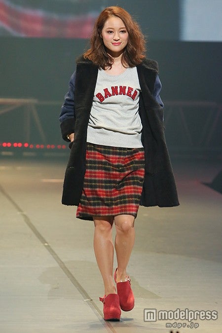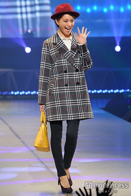 蛯原はチェック柄のチェスターコートにタイトパンツを合わせたメンズライクなコーディネート。会場に集まったファンからの歓声を浴びながら、笑顔で堂々たるウォーキングを披露した。