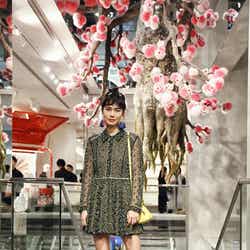 店内は、国内外で活躍する日本人フラワーアーティスト・東信との特別なコラボレーションにより、2016年春夏コレクションで発表された色とりどりの花が咲き誇る夢の国「FLOWERLAND(フラワーランド)」を表現。また、今回は同店の吹き抜けを飾る巨大オブジェ「ファーツリー(FUR TREE)」についで2回目となる東氏とのコラボレーションとなり、春の訪れを祝う日本古来の風習「花見」へのオマージュとして、「ファーツリー」に飾られたおよそ1200個ものフォックスファーのポンポンが桜色に色づく。