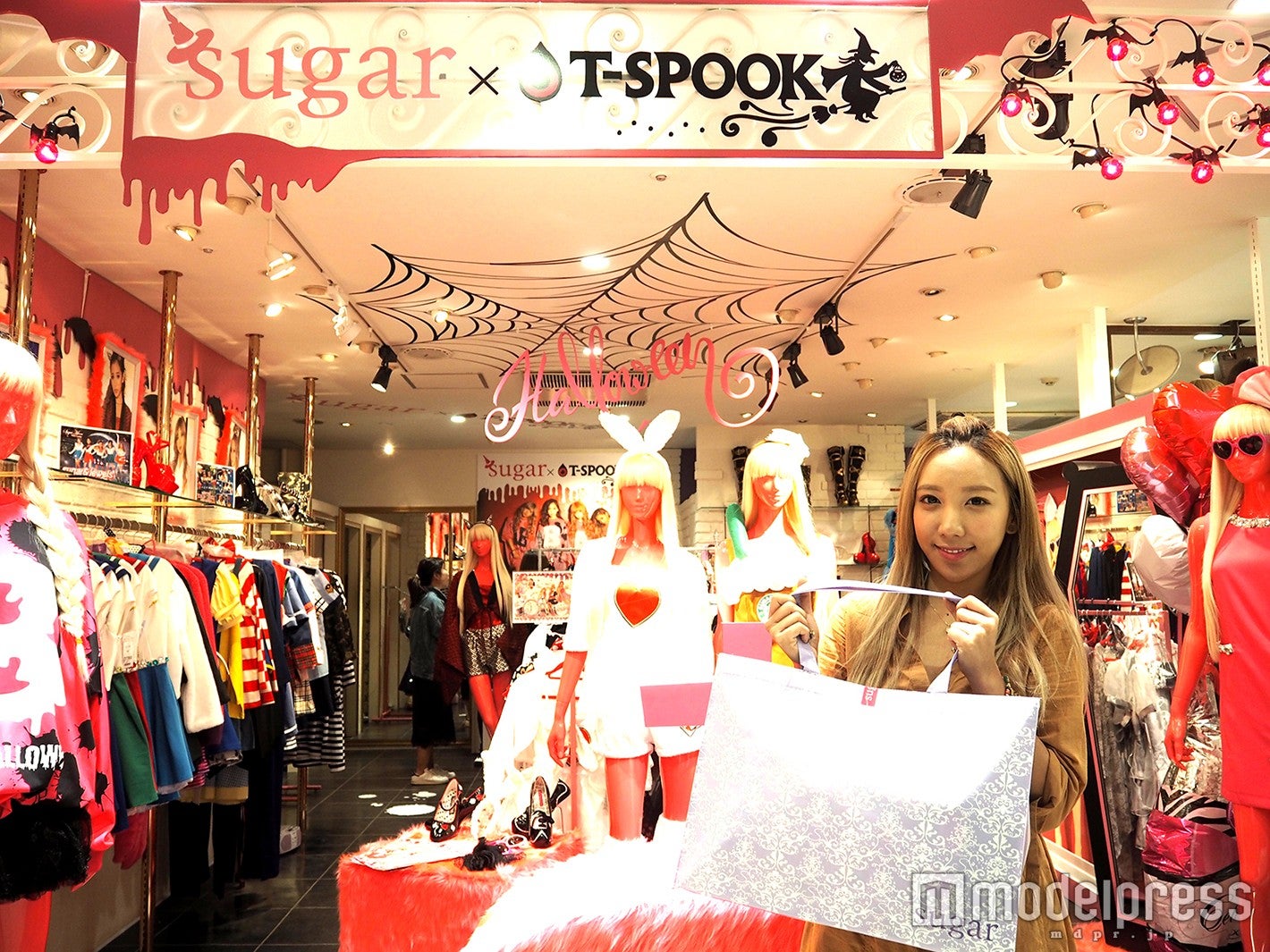 さて、続いて訪れたのはB1F「T-SPOOK×HAPPY・PARTY」。昨年SHIBUYA109に期間限定のハロウィンショップとしてオープンし好評だった、お台場最大級のハロウィンパレード&ライブイベント「めざましテレビ PRESENTS T-SPOOK」のハロウィンショップです。T-SPOOKのオフィシャルアイテムはもちろん、2016年の最新ハロウィンコスチュームや小物が満載のショップということで、ざわちんはもう1着コスチュームをゲットしたい様子。「ミニスカポリスをゲットしたから、またイメージの違うゾンビになれるコスチュームを探します!」と店内をくまなくチェックするざわちん。「可愛い系のコスチュームをあえて血のりで汚すとかもいいですよね」と“血のりテク上級者”なアイデアでコスチュームを探していると、ざわちんの望みを叶えるお望みのアイテムが!「これいいじゃん!」と手に取ったのは血のり&ぬいぐるみ付きでお得なブラッディーリトルガールコスチューム(税込6,793円)。