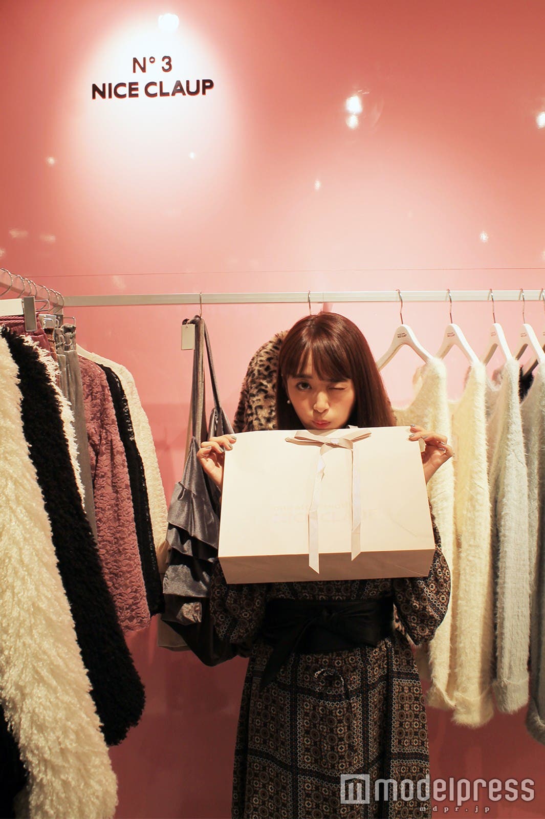 さて、次に訪れたのは“L.A CASUAL”をコンセプトにオンナらしい体のラインを露出し、カジュアルで色気のあるオンナの子のスタイルを提案する5F「GYDA(ジェイダ)」。「『GYDA』は撮影とかでもよく着るし、コラボアイテムも出させてもらってるんです。辛口カジュアルなアイテムが豊富なので、シンプルだけど大人っぽいスタイリングができるところが好き」と話すちぴちゃん。「やっぱり冬はファーアイテムが気になりますね。スタイリングに1つ入っているとトレンド感がでていいかも」と注目したのは、もこもこ感がオシャレで可愛いノーカラーファーコート(税込14,029円)。即決派のちぴちゃん、「GYDA」ではこちらのファーコートをお買い上げすることに決定。