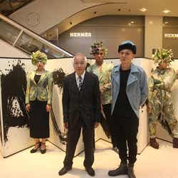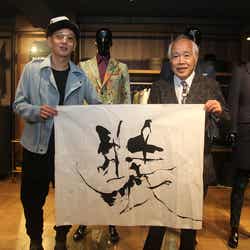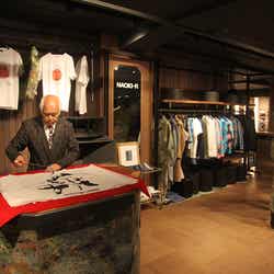 この日は初日を祝して、書道家の金田石城氏が駆けつけた。横川氏と親交の深い金田氏による贅沢な書道パフォーマンスを来客の前で披露。前日に映画『墨の魔術師』の完成披露舞台挨拶を行ったばかりの金田氏の登壇に、横川氏は笑みを浮かべていた。2020年の東京五輪に向け、日本を象徴させる“NAOKI-R×金田石城 コラボレーションTシャツ”も限定販売され、日本から世界への発信が始まった。