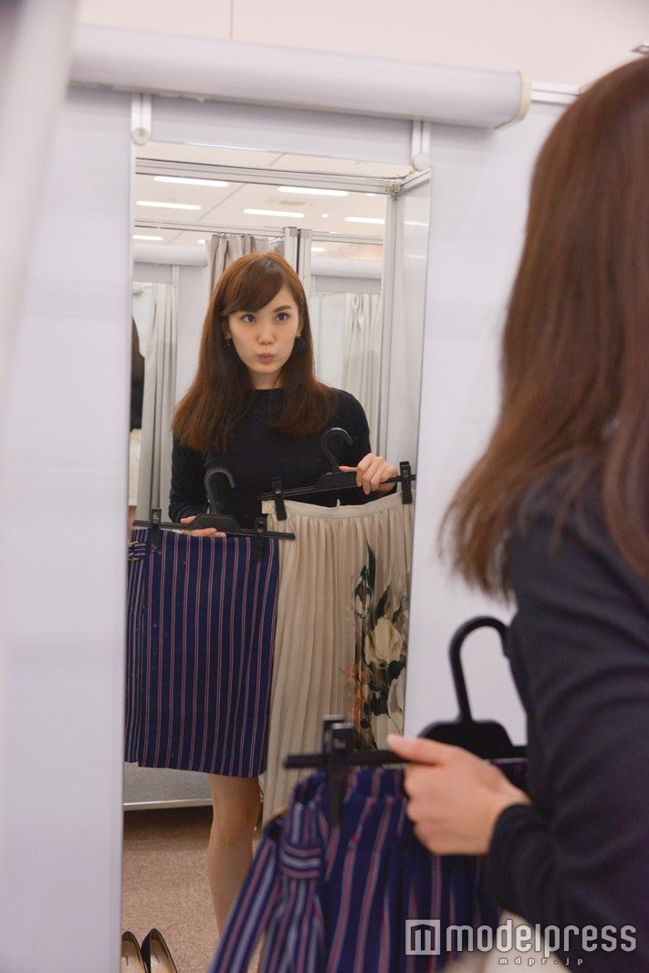 続いて、お目当てのブランド「ROYAL PARTY」では、キレイめに着られるコートを物色。今日のコーデにもマッチする、襟にファーが着いたチェックコートを見つけ、「可愛い!」とショッピングに夢中になっていました。
