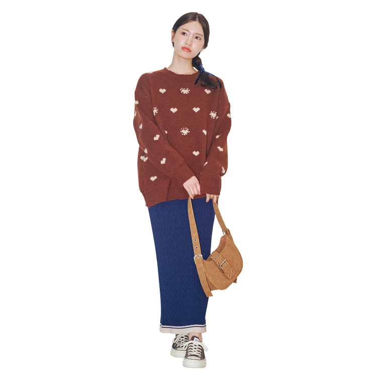 ニットスカートは着回し。ハート柄ニット 7,590円/MORE self LOVE バッグ 3,299円/WEGO スニーカー 9,900円/コンバース ヘアリボン/スタイリスト私物