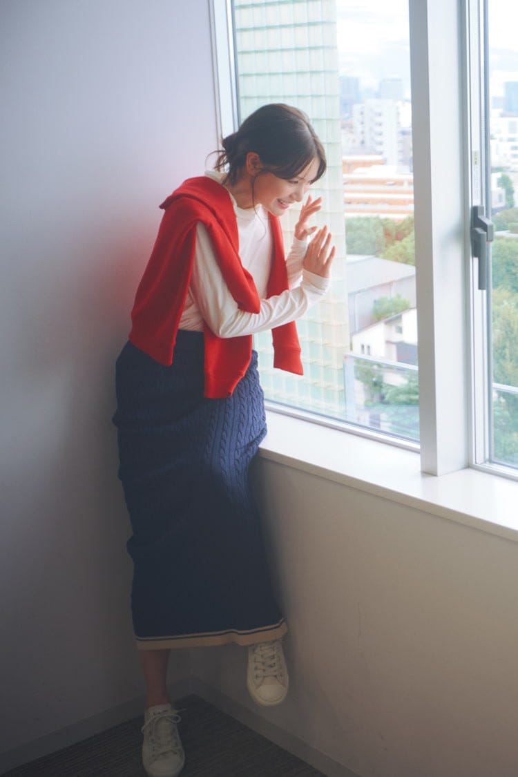 ニットスカートは着回し。赤スエット 3,157円/United Athle(キャブ)白タートルネック 18,800円/レイ ビームス(レイ ビームス 新宿) スニーカー 7,700円/コンバース