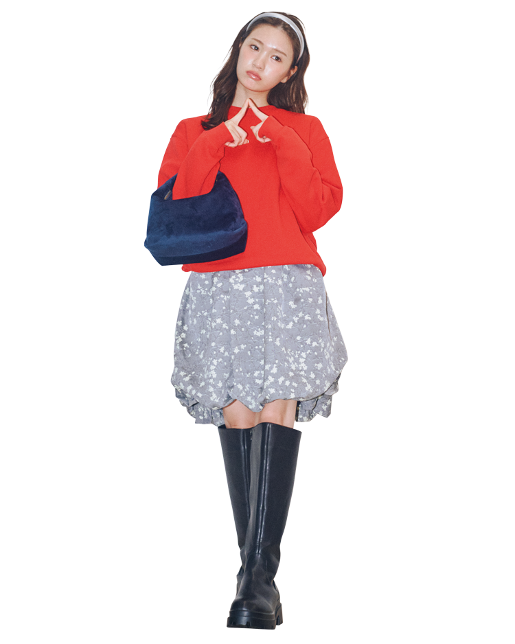 花柄バルーンスカート 22,000円/HONEY MI HONEY バッグ 3,190円、ロングブーツ 4,290円/ともに神戸レタス カチューシャ/スタイリスト私物Cordinate