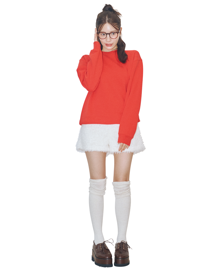 鮮やかな赤のスエットに白いスカートをあわせることで、赤がより際立つ印象に。ふわもこ素材のミニスカと脚の肌見せで女みをアピール♡