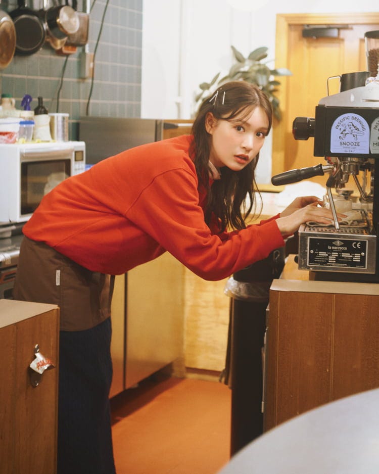 赤スエットは着回し。白タートルネック 18,800円/レイ ビームス(レイ ビームス 新宿)ニットスカート 10,450円/COCO DEAL(ココ ディール)ヘアピン/スタイリスト私物 エプロン/スタイリスト私物