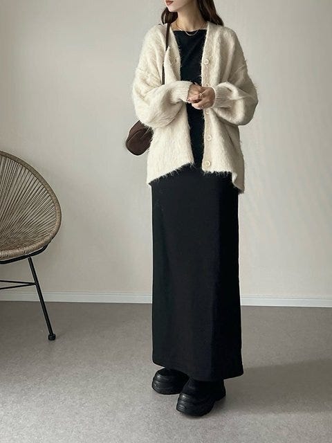 白のシャギーニットカーディガンを羽織り、インナーには黒のキャミワンピースを合わせた大人のレイヤードコーデ。シャギー素材の柔らかさがフェミニンな雰囲気をプラスし、Vネックの抜け感で顔まわりもすっきり。黒のキャミワンピースが全体を引き締めて、あたたかさとおしゃれな雰囲気を両立した着こなしに。