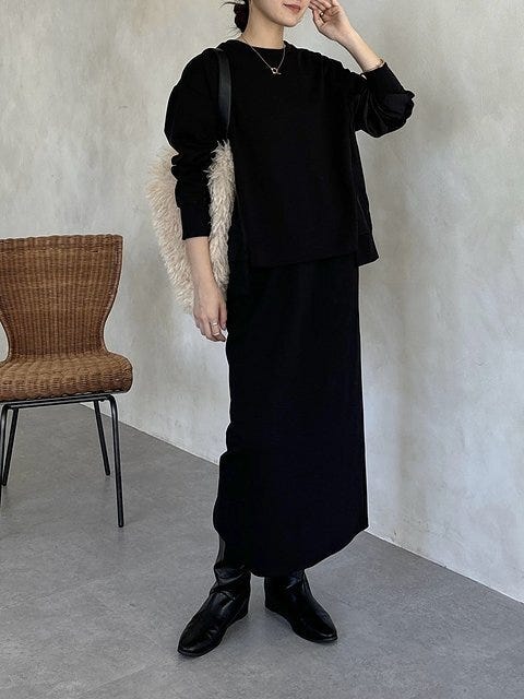 黒トップスに黒のタイトスカートを合わせたセットアップ風コーデは、シンプルながらもきちんと感があり、大人っぽく仕上がります。全身黒だと重見えしがちなので、足元は黒のブーツで引き締めつつ、白のファーバッグをプラスして抜け感と華やかさを演出。上下のタイトなシルエットと小物のコントラストで、シックながらもバランスの取れた冬の着こなしが完成します。