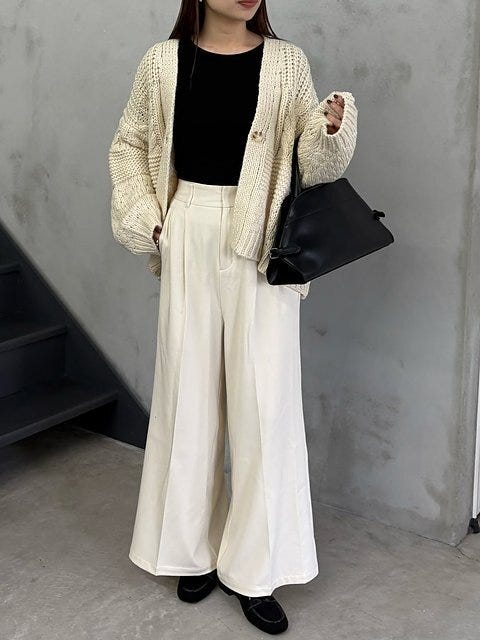 白のざっくり編んだケーブルニットカーディガンに、同じく白のワイドパンツを合わせた大人カジュアルコーデ。インナーには黒を取り入れることで全体が引き締まり、黒小物をプラスすればメリハリのある大人の着こなしに仕上がります。ざっくりとしたカーディガンの素材感がこなれ感を演出し、ゆったりとしたワイドパンツでリラックスしつつも洗練された印象に。