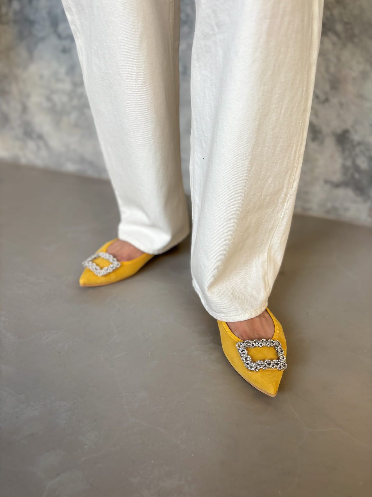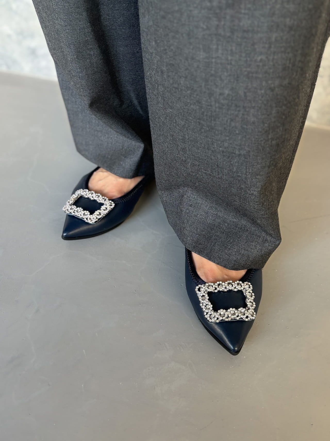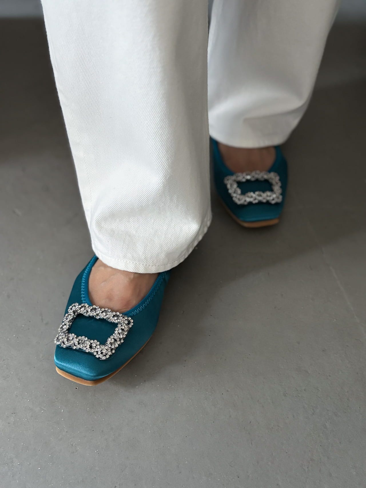 スムースレザーのnavyとblack、スエードのyellow、サテンのteal greenとbeige。素材によって表情が異なりながら、どれも日常に取り入れやすい華やかさがあります。