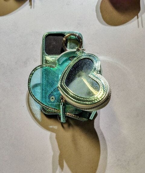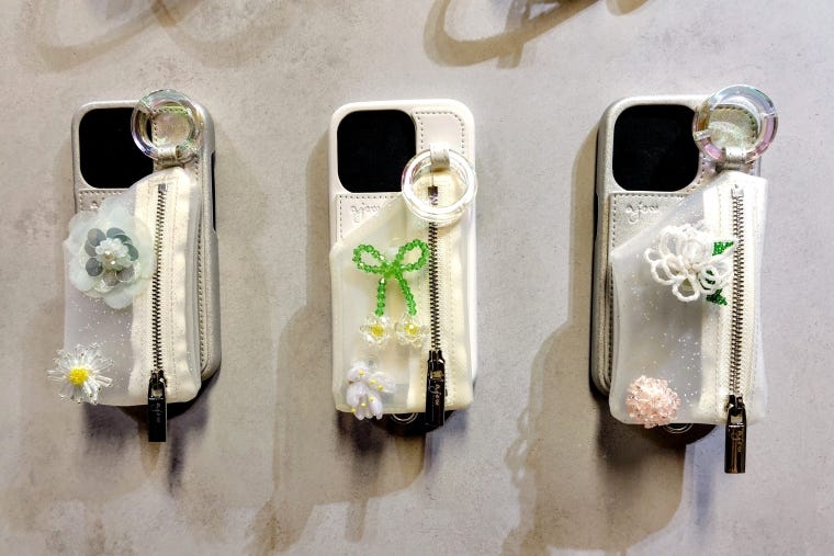 展示会で最も人気だったのが、ポケットに付けるビジューを選べるスマホケース。花をモチーフとしたビジューは3種類あり、ケースの色は白とグレーがある。1万2650~1万3750円。