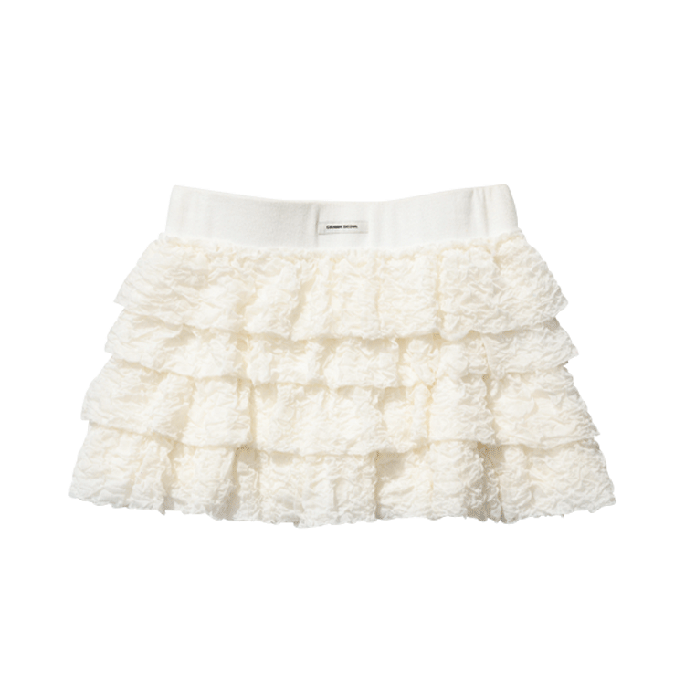 ふわっと広がる白のフリルがぷり可愛い♡ ミニスカートとしてだけじゃなくパンツとレイヤードもできる絶妙な丈感や、ふんわり広がるボリュームが◎。