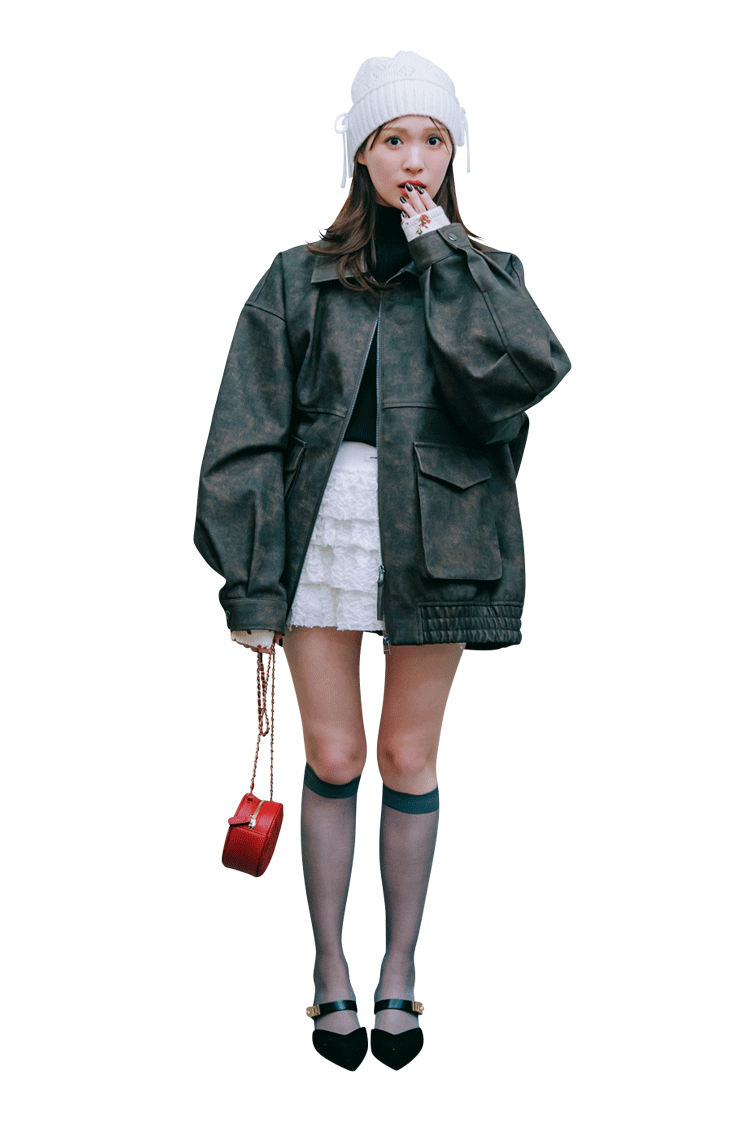 ティアードミニスカートは着回し。レザーブルゾン 6,599円/WEGO タートルネックトップス 2,199円/WEGO ティアードミニスカート 9,640円/CRANK(HANA SHOWROOM)ラメニットビーニー 4,950円/kaorinomori(OVERRIDE ルミネエスト新宿)ニットミトン 2,190円/ZARA(ザラ)バッグ 2,590円/神戸レタス ハイソックス 1,210円/靴下屋(Tabio)ミュール 9,900円/チャー