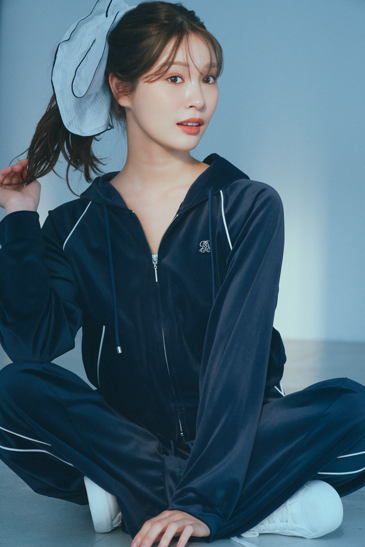 ジャージスタイルもベロアでファッショナブルに。すっぴんでもしゃれるBIGシュシュも◎。