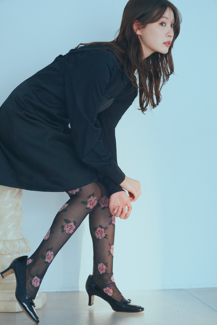 シンプルな黒コーデに主張の強いタイツでお目立ち