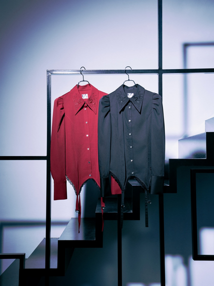 大崎ナナの商品は裾を折り返してビュスティエ風にも着られるシャツ、レザー調の素材で切り替えたジャケットと裾がレースアップになったパンツのセットアップなど、パンキッシュなスタイル。
