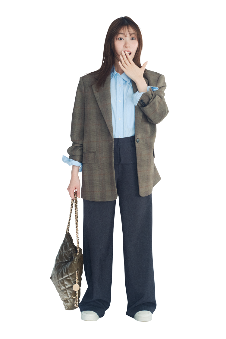 チェックジャケットは着回し。ブルーシャツ 3,990円/UNIQLO フリルつきスラックス 15,955円/ROSE FRANTZ(HANA SHOWROOM)バッグ 8,998円/SLY(バロックジャパン リミテッド)スニーカー 17,600円/プラス ダイアナ(ダイアナ 銀座本店)