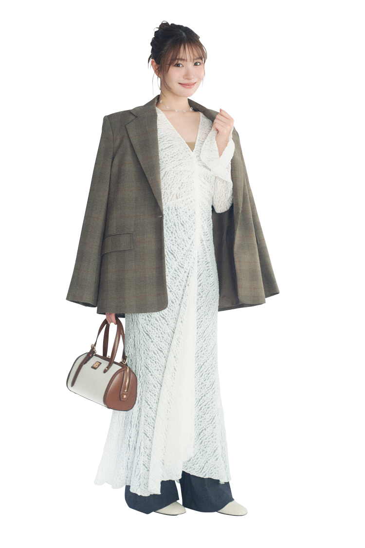 チェックジャケットは着回し。ワンピース 16,500円/COCO DEAL(ココ ディール)フリルつきスラックス 15,955円/ROSE FRANTZ(HANA SHOWROOM)ネックレス 3,080円/アネモネ(サンポークリエイト)バッグ 11,990円/RANDA スニーカー 17,600円/プラスダイアナ(ダイアナ 銀座本店)インナー/スタイリスト私物