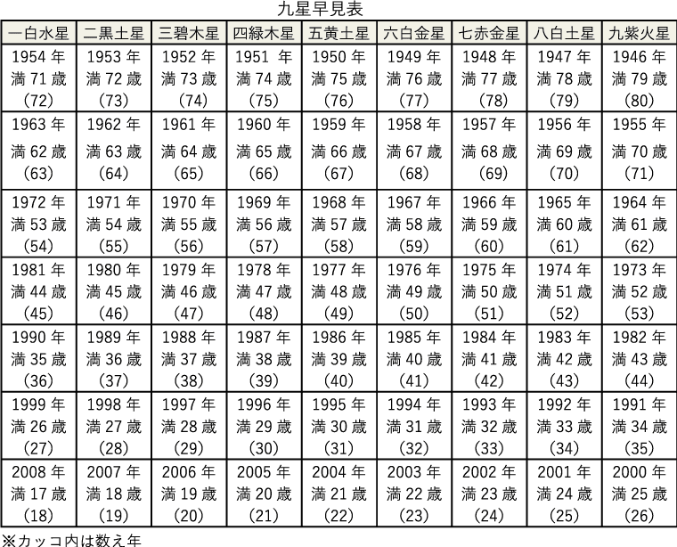 生まれ年で自分の九星が分かります。早見表をご確認ください。