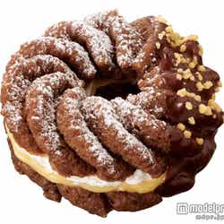ココア風味のポン・デ・リング生地に、チョコクリームをサンドし、さらにチョコでコーティングし、チョコクランチをトッピング。