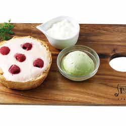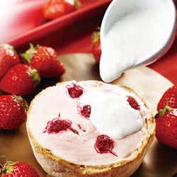 「焼きたてミニチーズタルト いちご×杏仁」は、ゴロっと果実感のあるいちごのコンフィチュールを中に混ぜ込んだいちごチーズタルト生地の表面に、甘酸っぱいフランボワーズをのせ、焼き上げた一品。別に添えたクラッシュ杏仁豆腐と一緒に食べると、ベリーの爽やかな美味しさがより引き立つ味わいになっている。