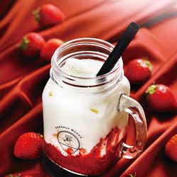 「つぶつぶいちごのミルクラテ」は、果肉がゴロゴロッと贅沢に入った、いちごのコンフィチュールとミルクの2層仕立てのコールドドリンク。甘さ控えめで爽やかな美味しさが楽しめる、まろやかで優しい味わいが楽しめる。(modelpress編集部)焼きたてミニチーズタルト いちご×杏仁