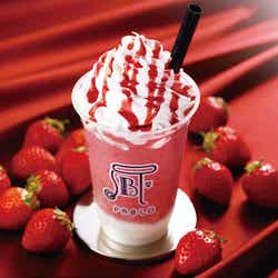 「いちごと杏仁のフルーテ」は底に砕いた杏仁豆腐を敷き、いちごと杏仁豆腐のチーズスムージー。上にはクリームチーズを入れたふわふわのエスプーマ生クリームをあしらい、爽やかないちごソースをトッピング。杏仁の爽やかな風味といちごの甘酸っぱさが絶妙にマッチしたスムージーを堪能できる。いちごを贅沢に使ったドリンク