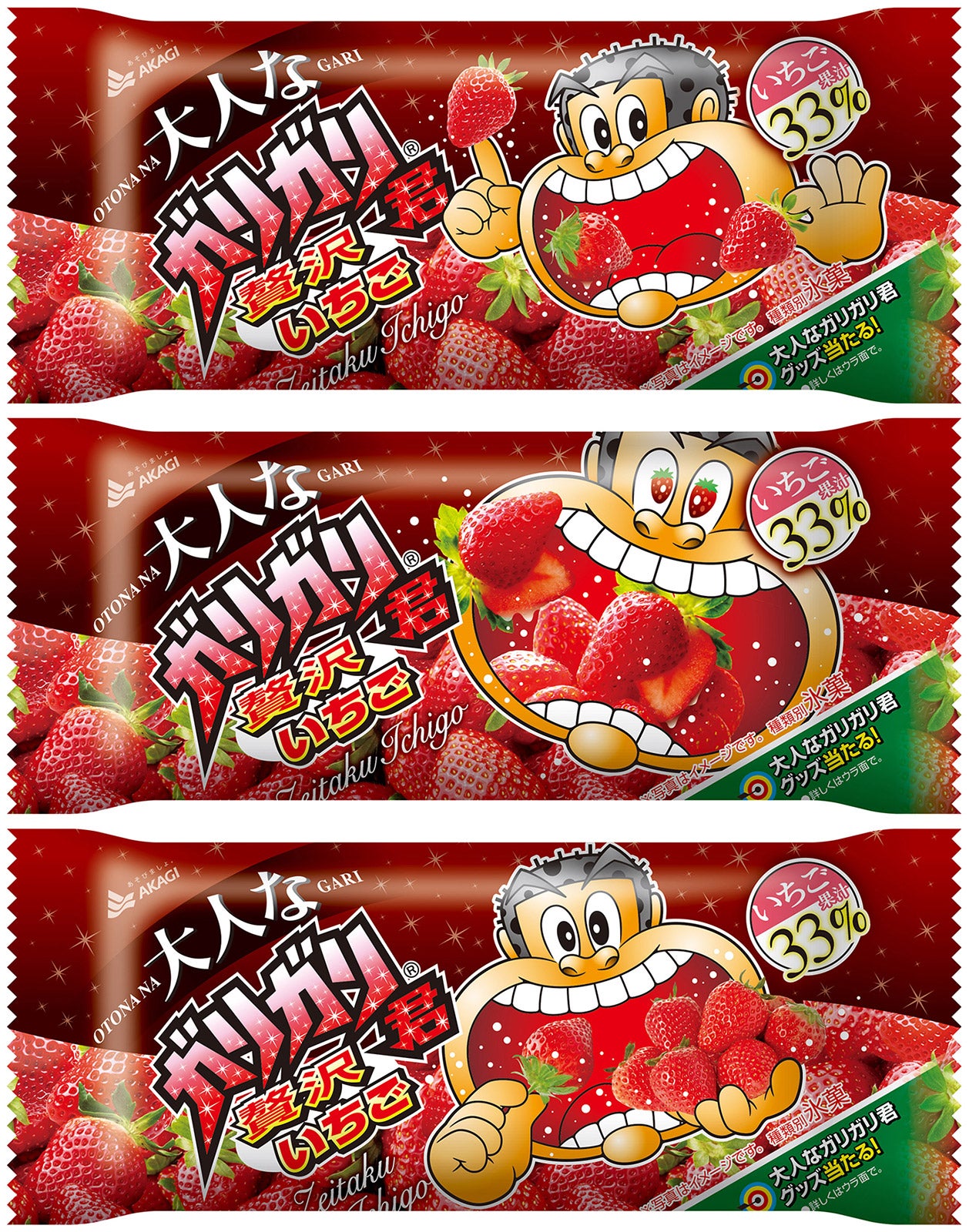 「大人なガリガリ君贅沢いちご」は、いちご味のアイスキャンディーに、ジェラートのような食感のいちご味のかき氷を入れたアイスキャンディー。また、いちご果汁は「ハニー種、センガセンガナ種、さがほのか」の3種類のいちご果汁をブレンドしている。